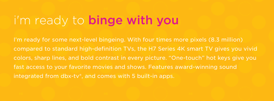 But mostly it’s because it’s daring. We fought hard for a tone that was witty and youthful. The site is a riot of neon colors and smiling faces. It’s funny and light, and peppered with humor in places where one is used to finding straight-up utility. (Our designer, Corey Price, used “words for nerds” for temporary placeholder copy over the tech specs. He did it to make me laugh, but I called his bluff and kept it. Look at a product detail page if you don’t believe me.)